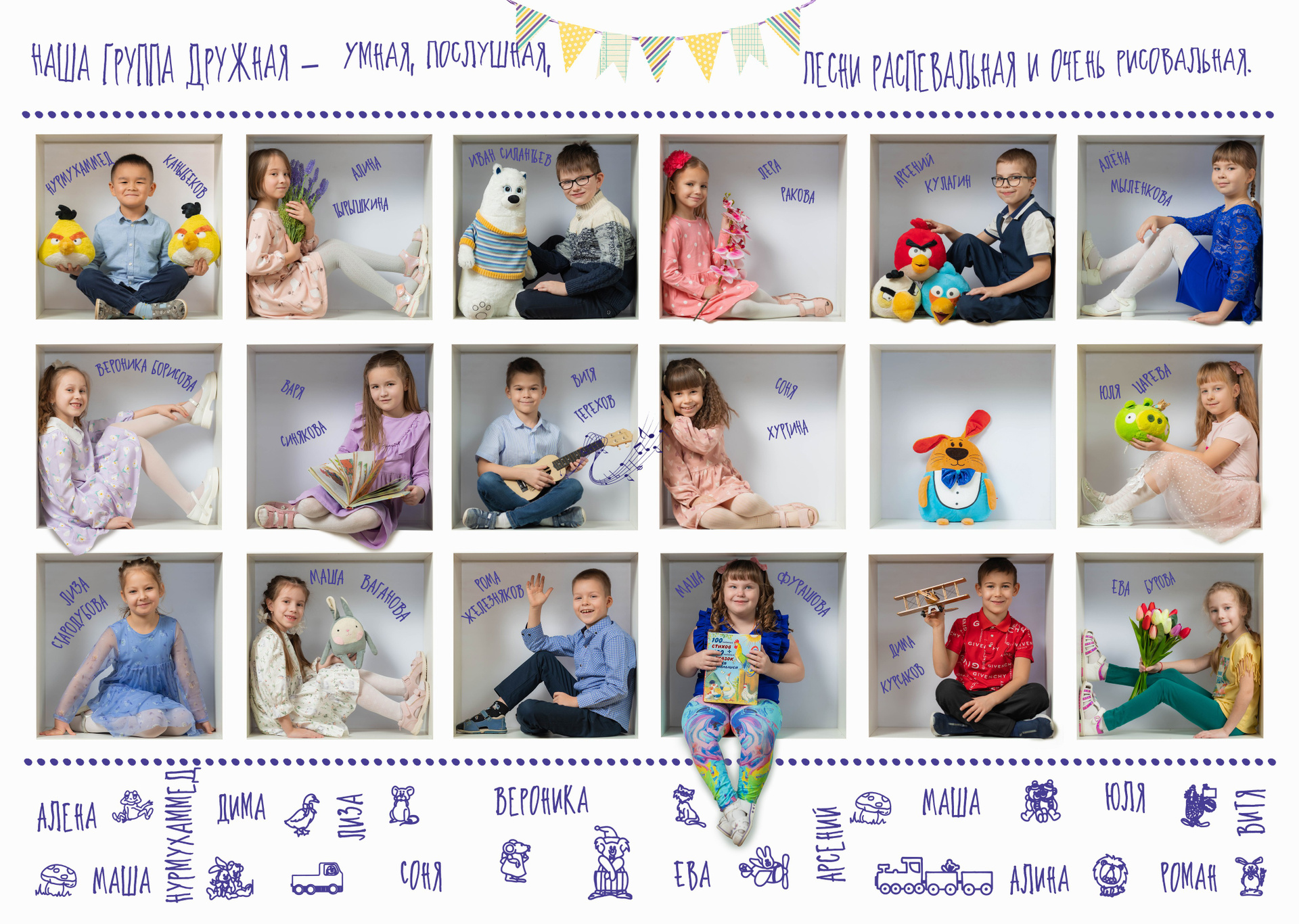 — Портретная съемка в кубике. (Проработка поз — у каждого ребенка на виньетке разные позы).